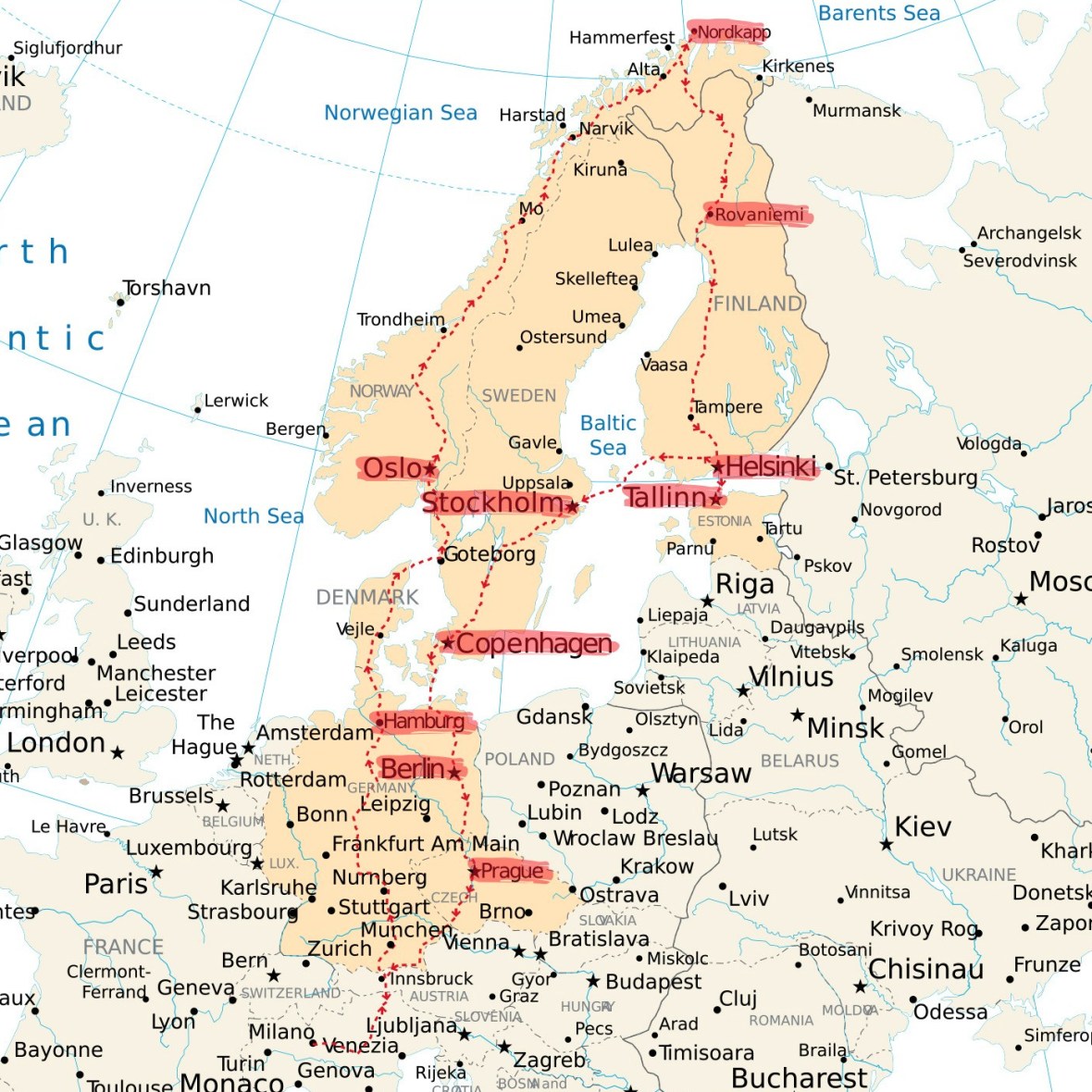 Questo lungo viaggio ha attraversato tante nazioni e città eccezionali… vivaci e colorate, armoniose e ricche di storia… Ha attraversato una gran parte d’Europa. Ci ha fatto conoscere luoghi, già di dominio pubblico e alcuni meno, perchè più selvaggi e nascosti… Ci ha portato in Germania, Norvegia, Finlandia, Estonia, Svezia, Danimarca, Repubblica Ceca… Per arrivare e tornare da Nordkapp…